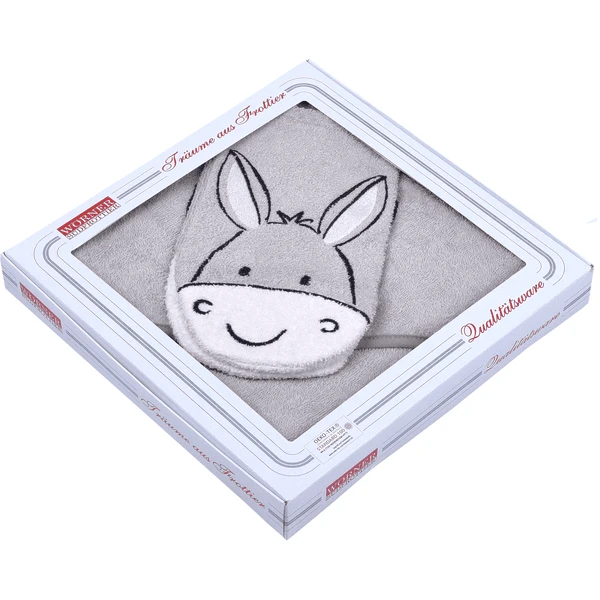 WÖRNER SÜDFROTTIER Set Kapuzenbadetuch und Waschhandschuh Esel hellgrau 80 x 80 cm